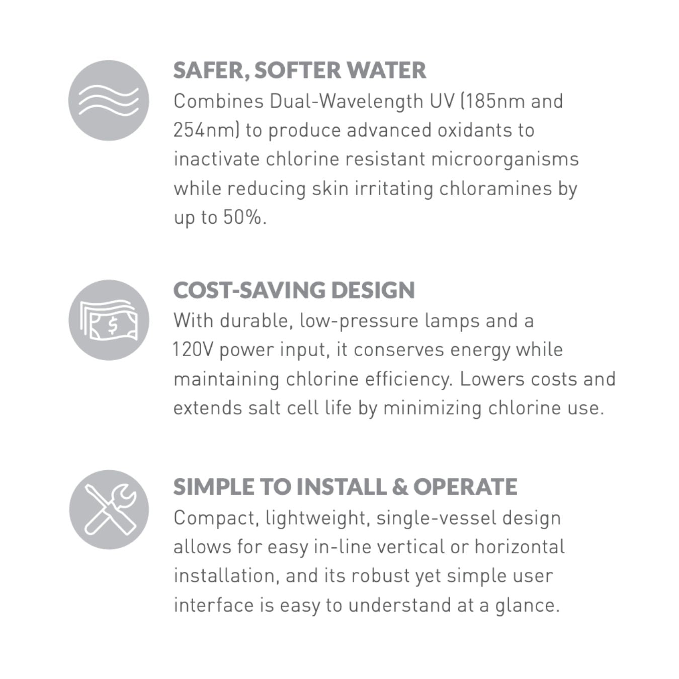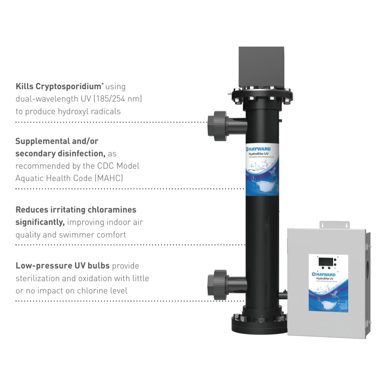 Utilizes Dual-Wavelength UV (185nm & 254nm) to produce Hydroxyl Radicals to create triple-acting disinfection power that inactivates waterborne pathogens— including ones resistant to traditional chlorine. The U.S. Centers for Disease Control (CDC) recommends UV for supplemental and secondary disinfection in every commercial pool, and there's no better choice than the all-in-one protection of HydroRite UV when it comes to the safety of your guests.