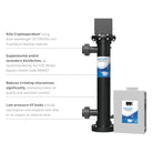 The UV Light Chamber is made from highly polished 316L stainless steel lined PVC. Quartz sleeves separate the low pressure, high output amalgam germicidal lamps from the water. The water to be treated flows into the bottom of the chamber. Once in the chamber, the germicidal bulbs produce a minimum 3-log reduction in pathogens. The water is then returned to the source.