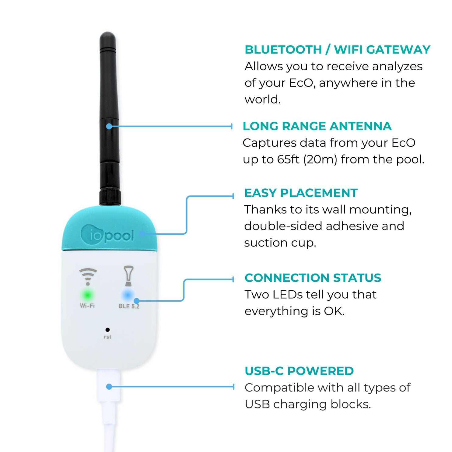 - iopool cOnnect Bluetooth / Wi-Fi Gateway for a 24/7 connectivity (incl. in EcO Start and Connect only);