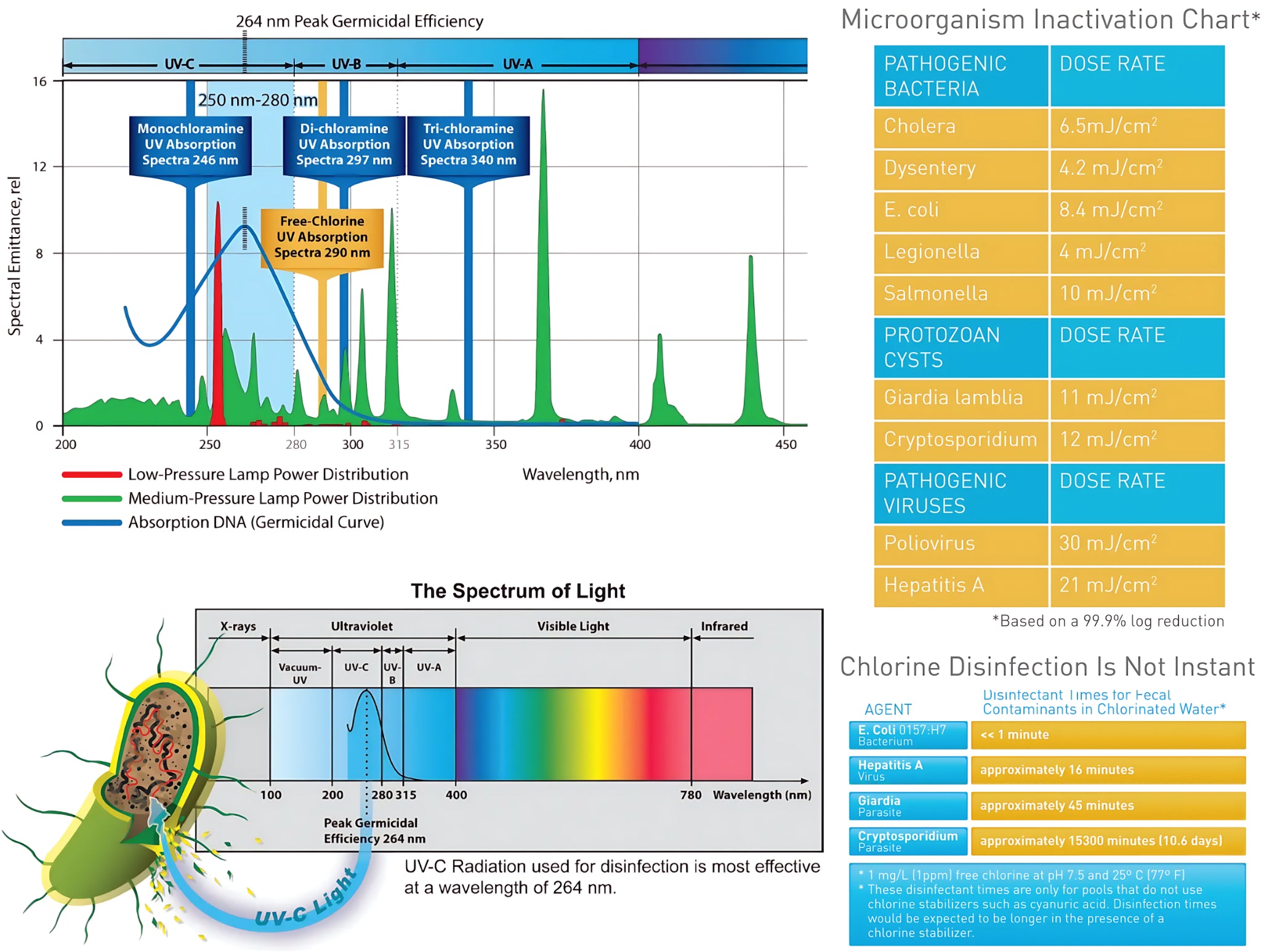 UV is instant germicidal disinfection, Free Chlorine is not. UV disinfection inactivates germs (Cryptosporidium, Giardia and E. Coli.) most commonly associated with RWI’s. UV disinfection provides instant (single-pass) treatment unlike Free-Chlorine and ozone. UV systems are a “Green” Technology and deliver multiple benefits contributing to healthy swim water.
